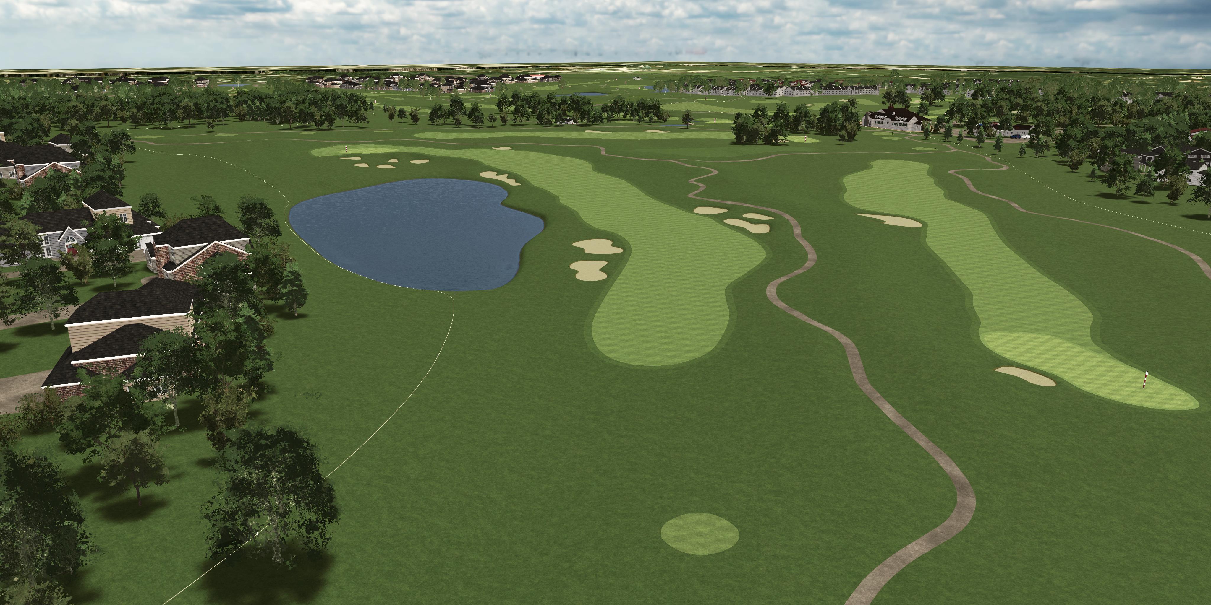 Golf course with a lake and greenery under a blue sky