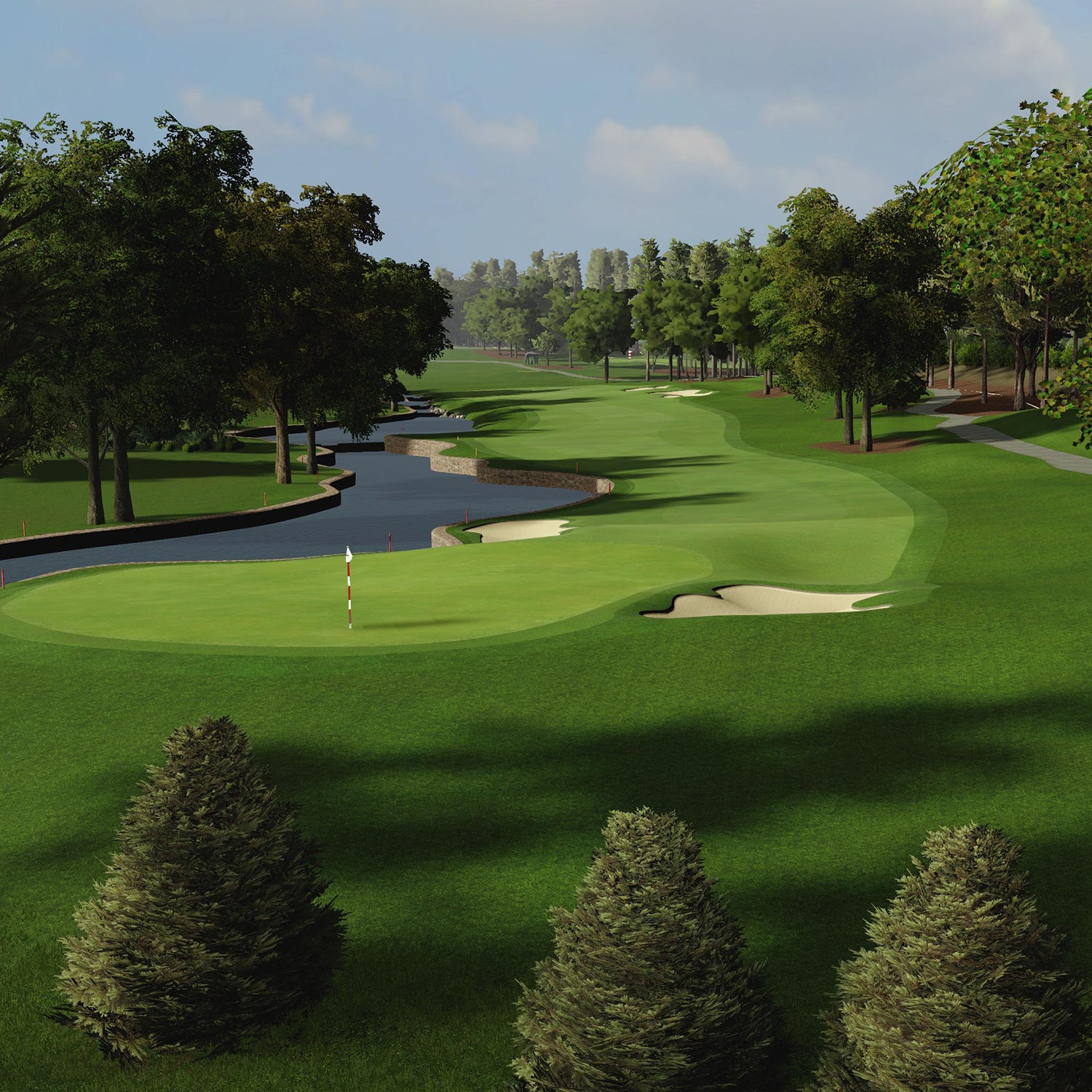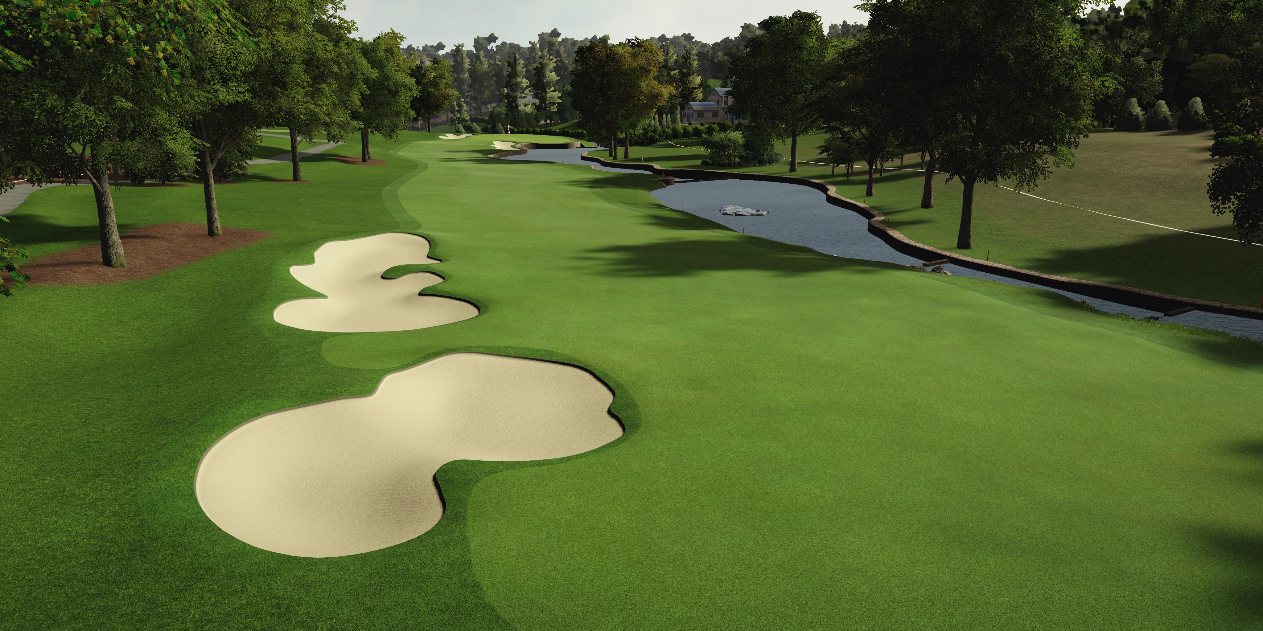 A long first hole that bends slightly right. Favor fading tee shot to stay clear of the left bunker and the uphill approach adds extra distance, making par is a strong start.