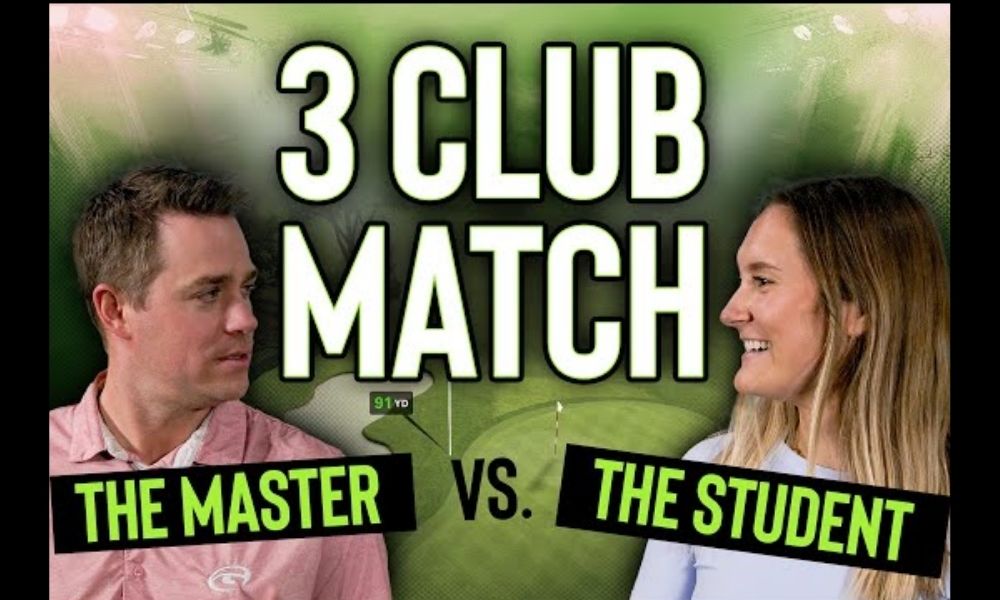 00:00:00 Josh and I are doing a three-hole match play challenge using a new SKYTRAK 5.2 feature, but Josh can only use three clubs while I have my full bag.
